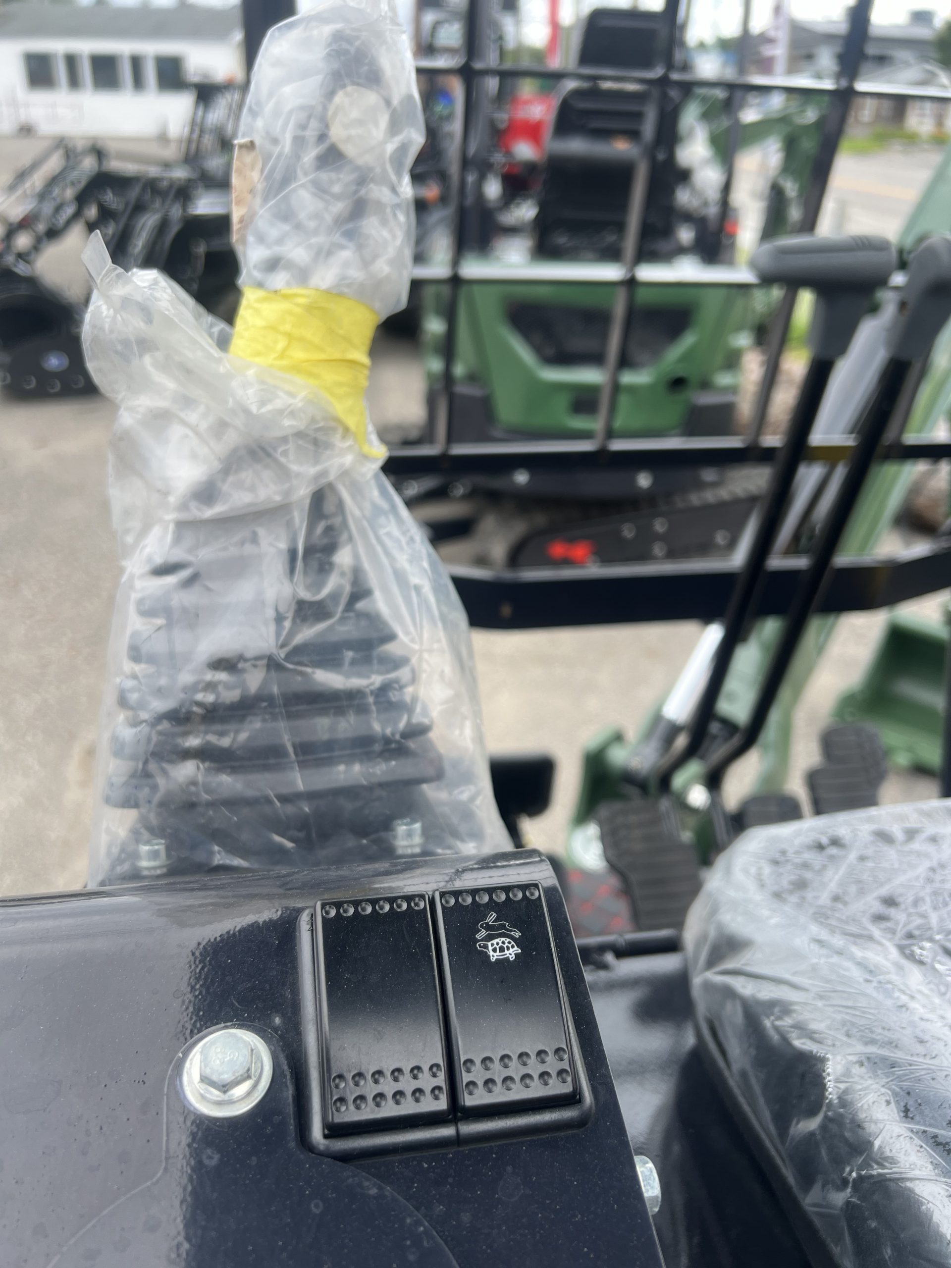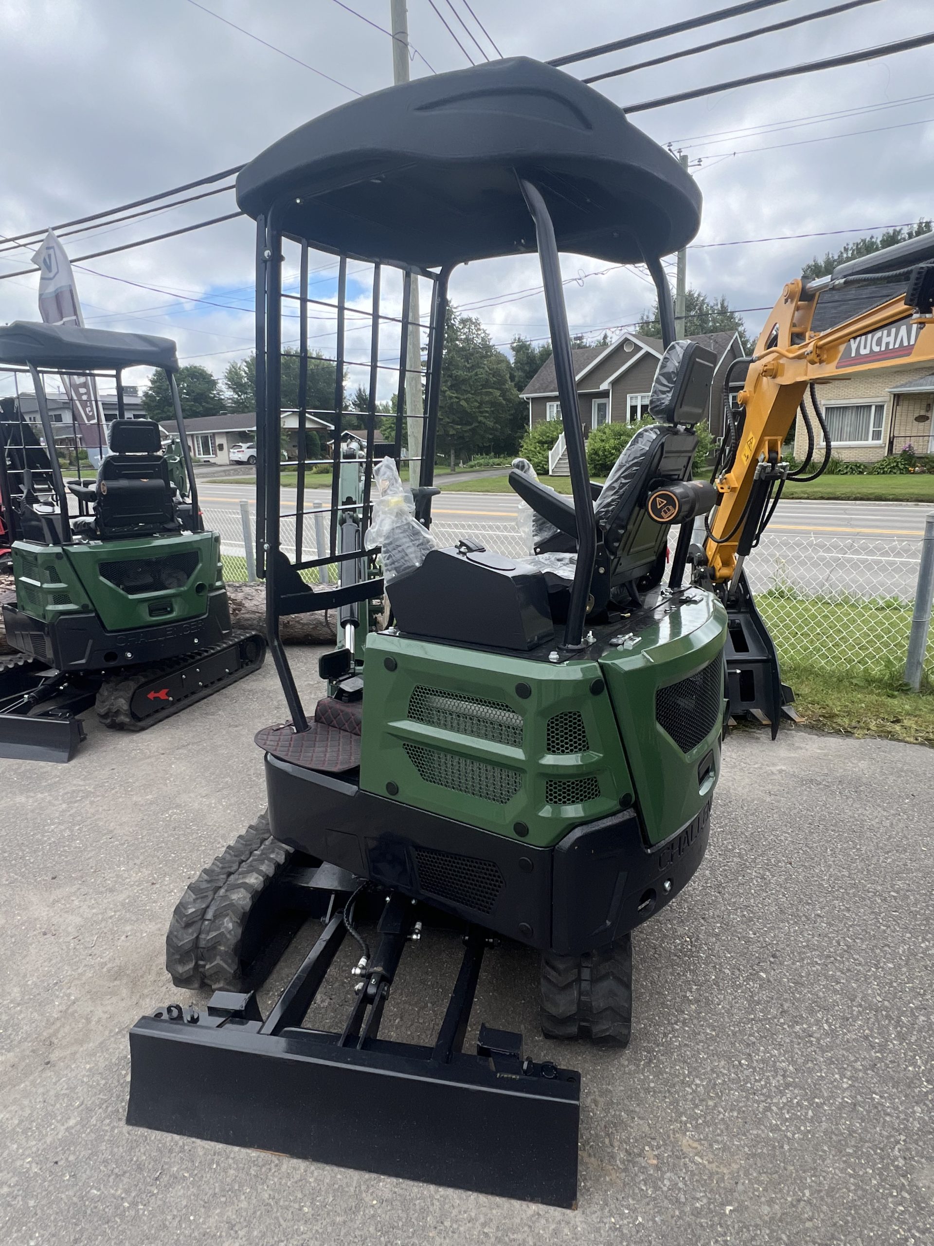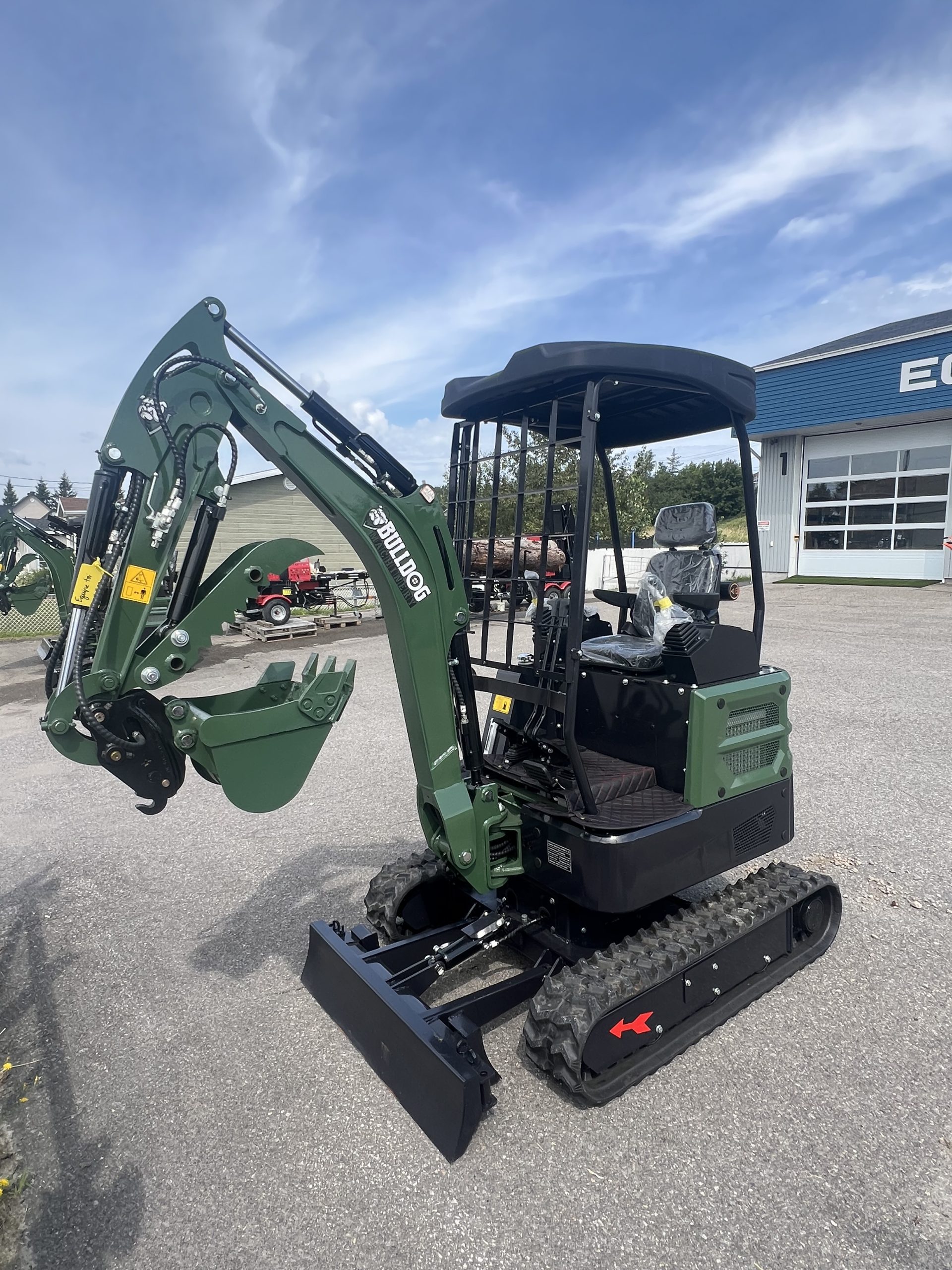 Godet standard (15 po), pouce hydraulique, toit pleine grandeur, éclairage DEL, panneau de commande et siège ergonomique pleine grandeur.